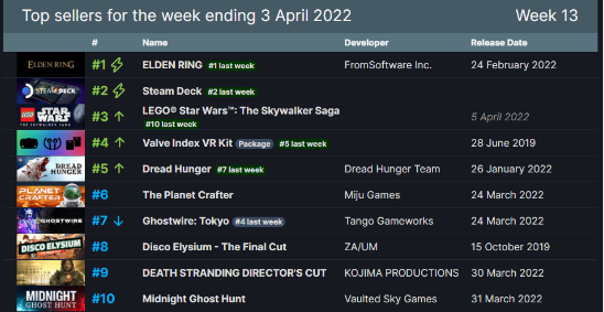 Steam公开了上一周游戏销量排行,数据时间截止今年4月3日,《艾尔登法环》继续获得周销榜第一名