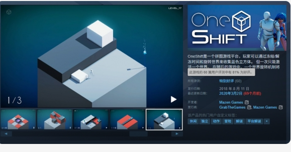 平台冒险解谜游戏《OneShift》现在开启上线Steam平台限时免费领取,这次领取时间有限到2025年11月11日凌晨两点,获得特别好评 ”